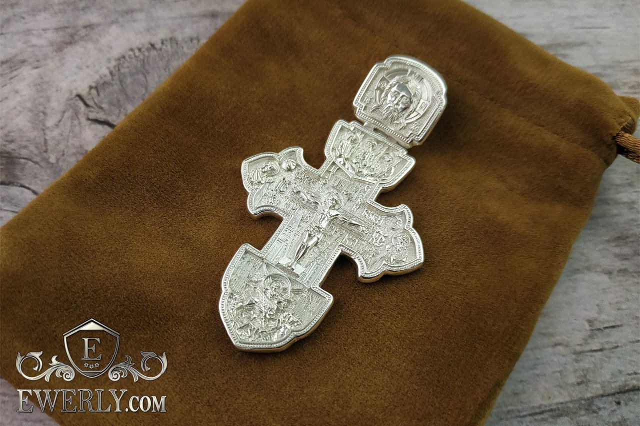 Depicted on the cross: The crucifixion of Christ. Holy Trinity. Archangel Michael. Holy Warriors. Tikhvin icon of the Mother of God. Orthodox cross.Height: 8 mm